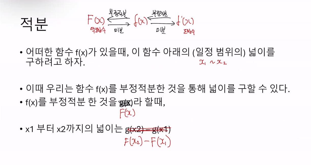 •어떠한 함수 f(x)가 있을때, 이 함수 아래의 (일정 범위의) 넓이를 구하려고 하자.•이때 우리는 함수 f(x)를 부정적분한 것을 통해 넓이를 구할 수 있다.•f(x)를 부정적분 한 것을 g(x)라 할때,•x1 부터 x2까지의 넓이는 g(x2) – g(x1)- 부정적분: 함수의 원시함수를 구하며, 적분 상수 C를 포함합니다. 특정 구간이 정해지지 않고 함수 자체를 적분합니다.