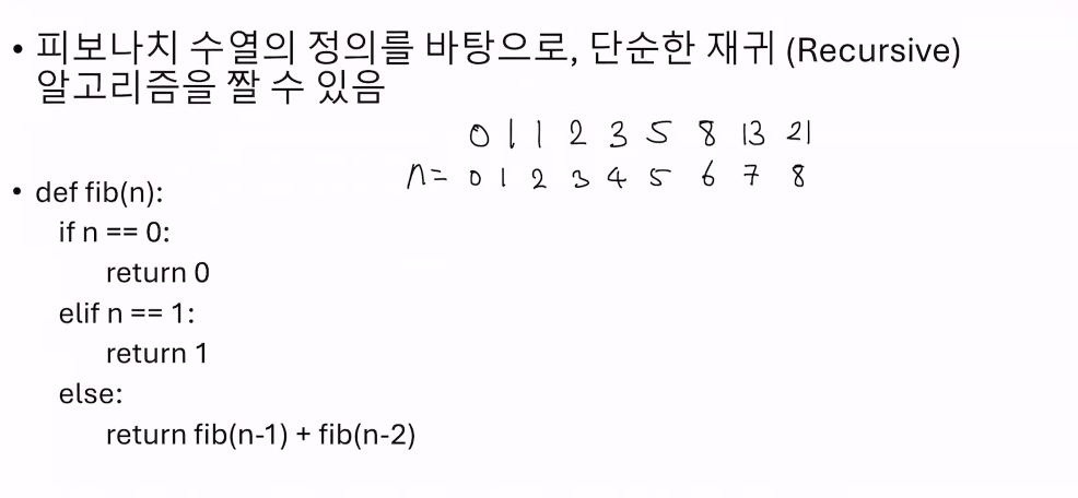•따라서, 이미 계산한 값들을 적어 놓고 재사용한다면 (Memoization), 효율을 크게 올릴 수 있을 것def dyn_fib(n): F = list() F[0] = 0 F[1] = 1 for i in range(2, n+1): F[i] = F[i-1] + F[i-2] return F[n]