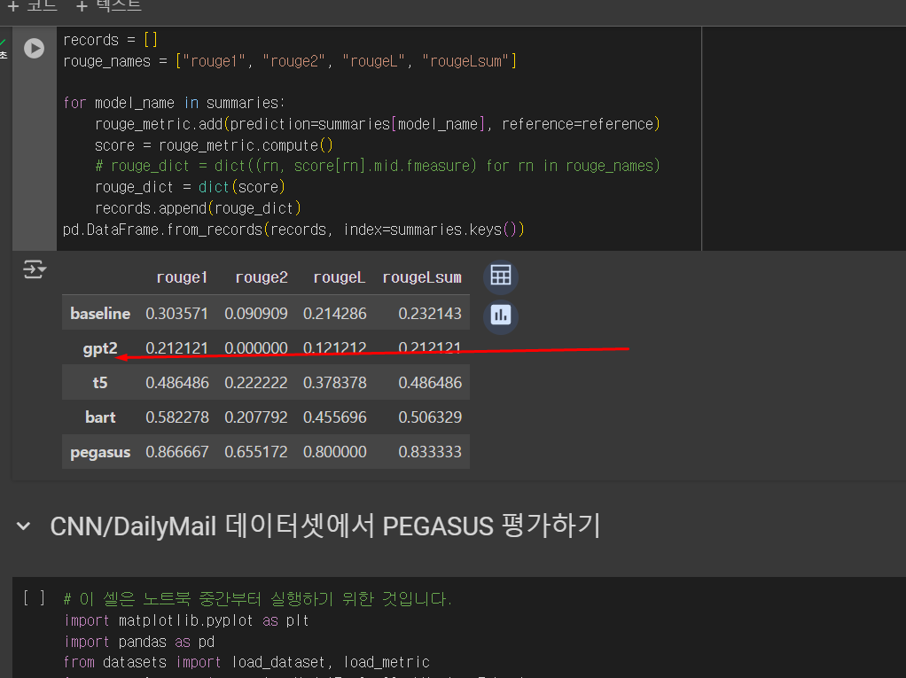 gpt2는 요약작업에서 pretrain만 되어있어서 finetuning된 bart, pegasus 가 훨씬 요약 잘해서 rouge score 가 높다.