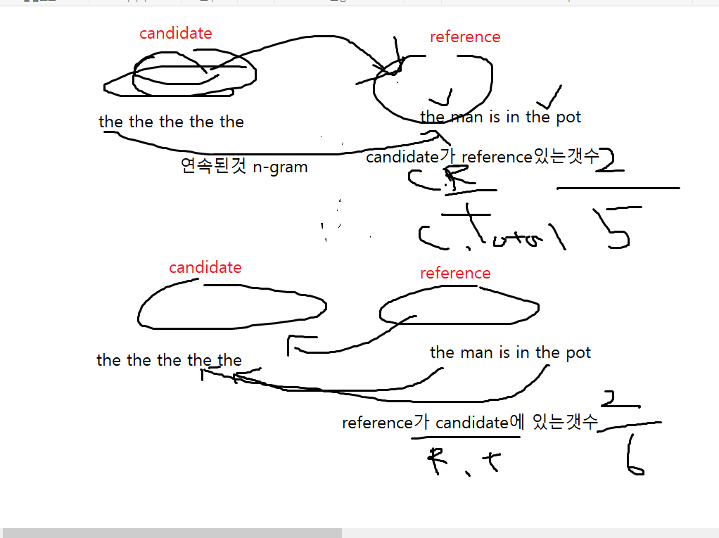 모델이 생성한 candidate에서의 ngram들이 reference에서 얼마나 많이 포함되있느냐를 precision의 개념