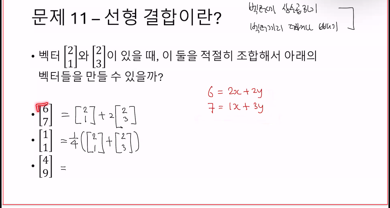 벡터 x, y에 상수를 곱하고 더해서 z를 만들었다면, z는 x,y의 선행결합이다.