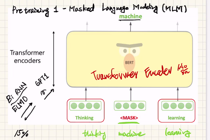 pretraining 과정은 semi supervised training으로 가운데단어 맞추기를 학습한후 데이터에 있는 단어로 test한후,